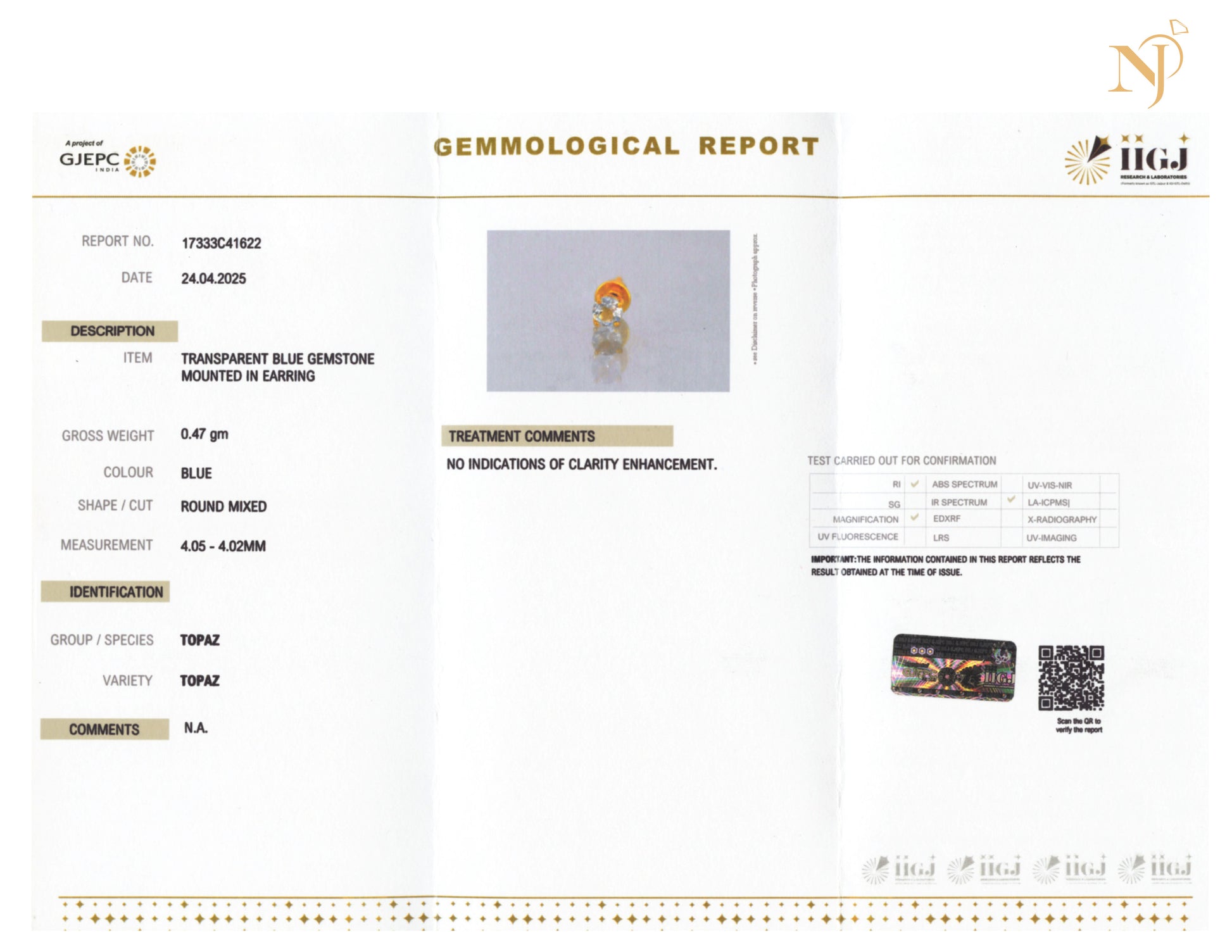 - Third-party certified natural Blue Topaz